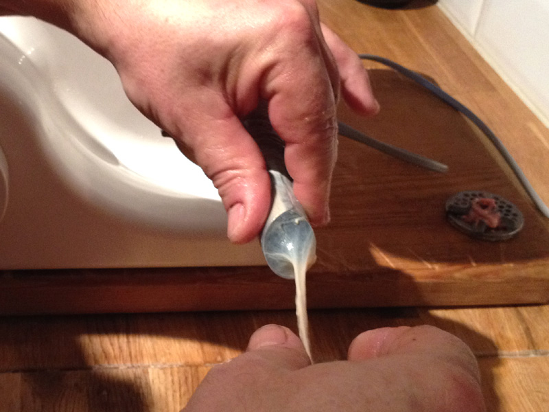 Das war schon mal lecker! Nun den Schweinedarm schön vorsichtig mit Gefühl aufziehen.